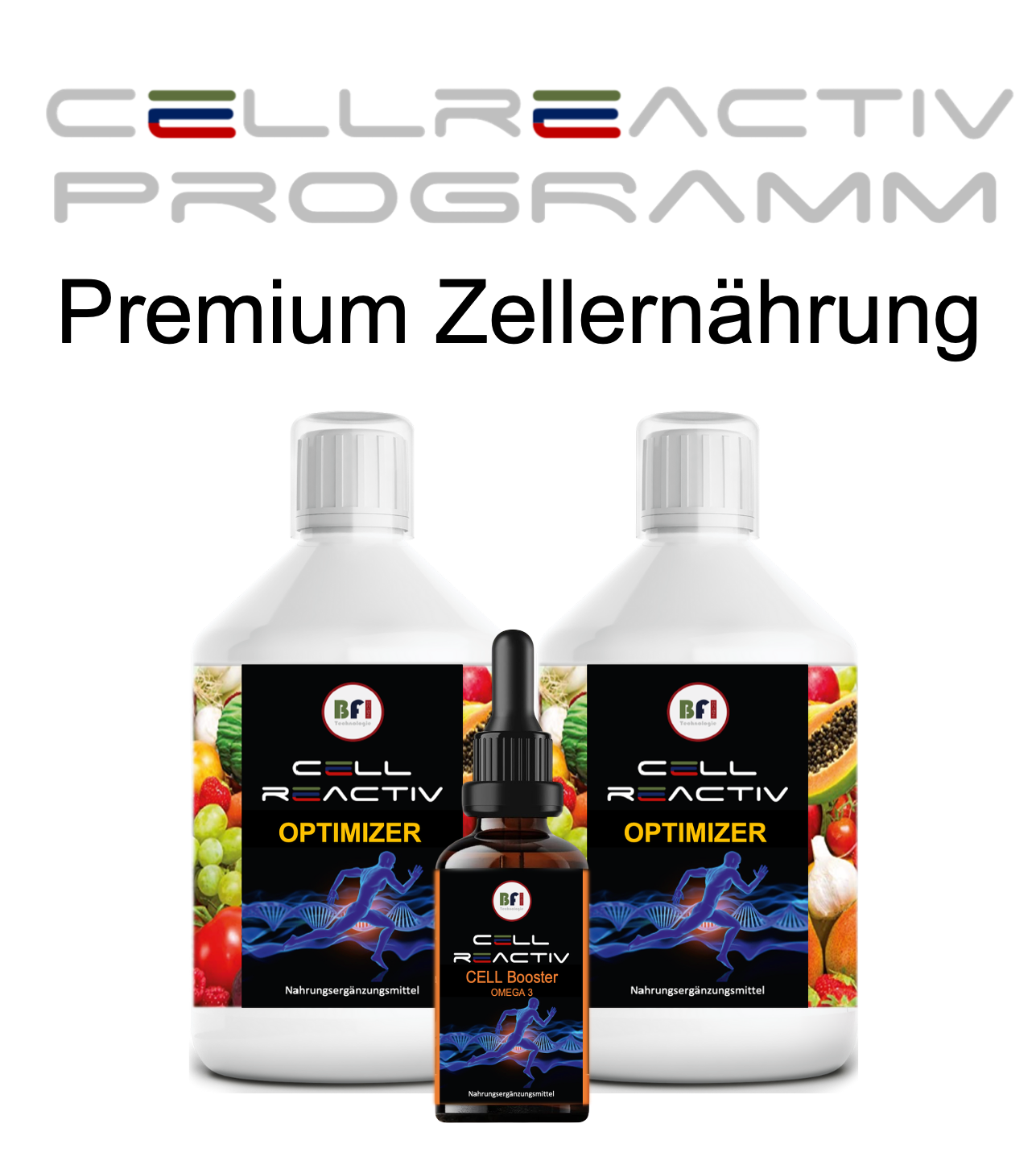 Du erhältst 2 x CELL Optimizer (2 x 500 ml) mit BFI-inside Technologie und 1 x CELL Booster Omega 3 (60 ml) eine optimale Balance der Fettsäuren Omega 6 und Omega3 für weiche, flexibel und durchlässige Zellmembranen.